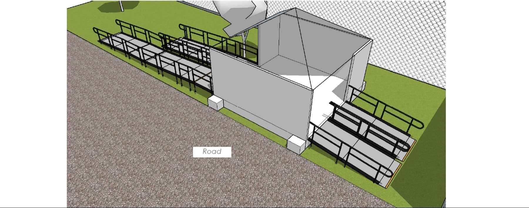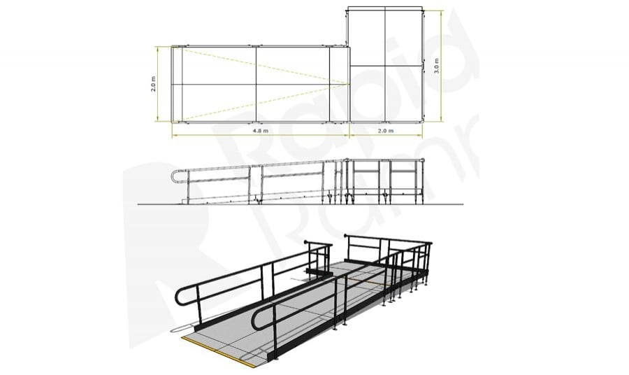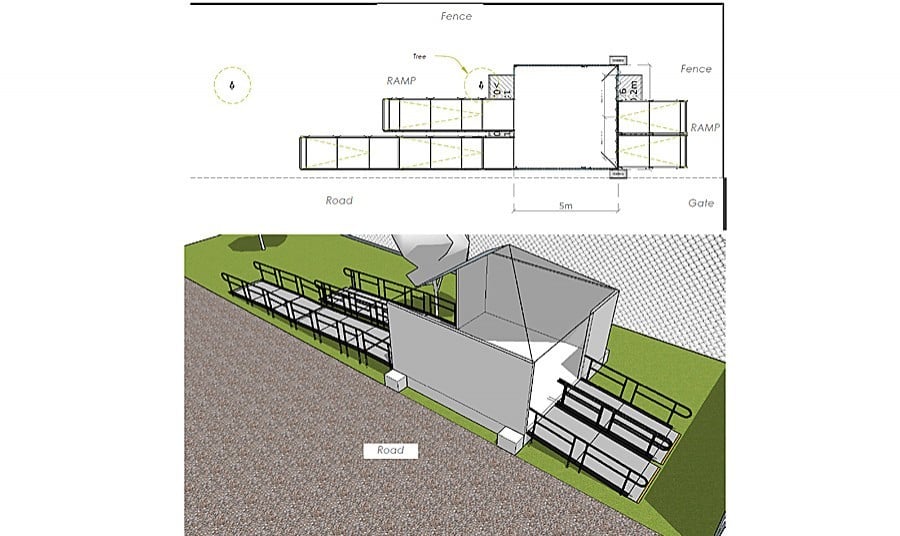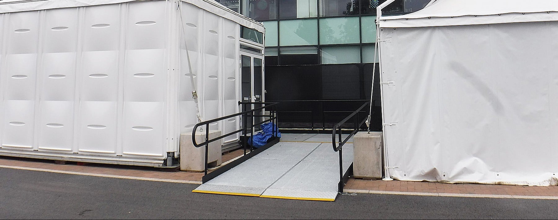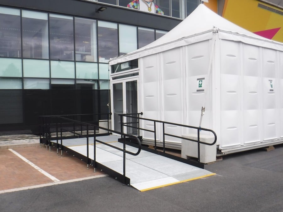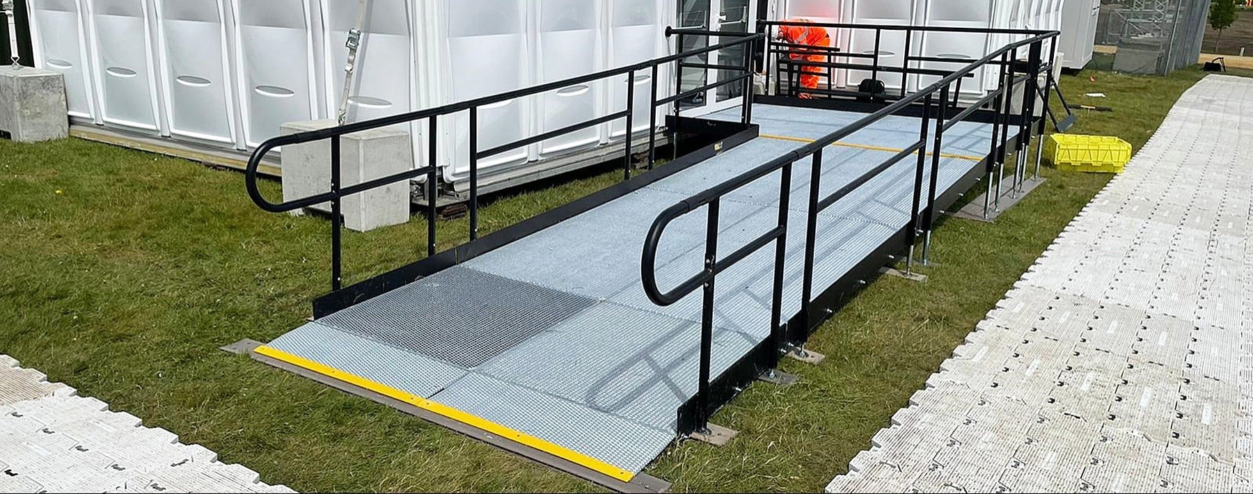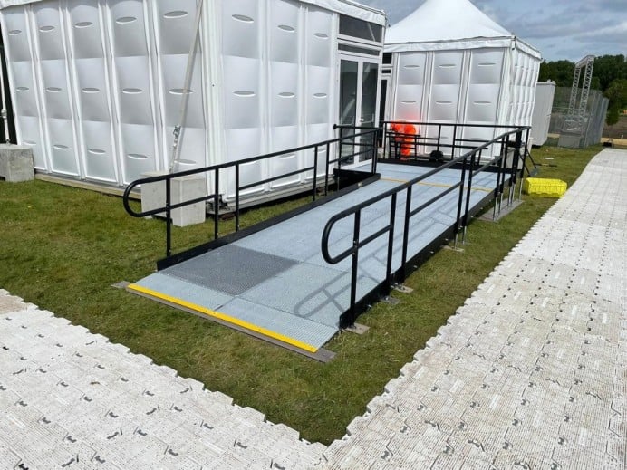 Temporary prefabricated ramps to the various marquees, including the spectator first aid tent, the site security tent, the spectator family rest area, the toilet block, and shower Unit.