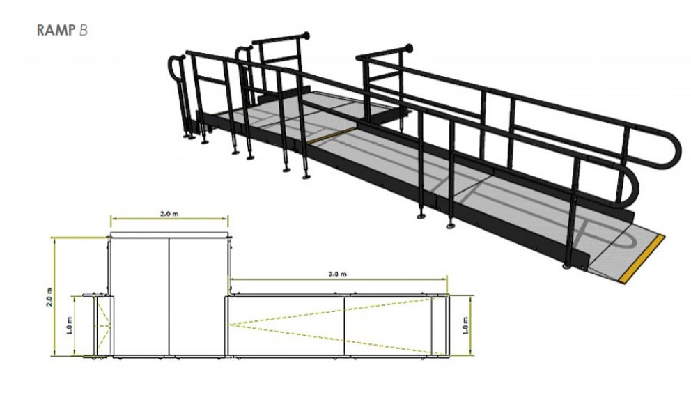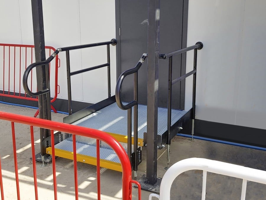 - Infill Handrail - included on step unit linked with Ramp E. The product prevents users from climbing or falling through gaps.