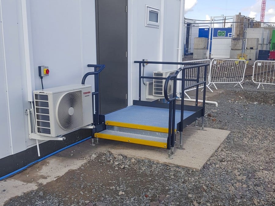 Temporary step units and ramps to the welfare cabin.