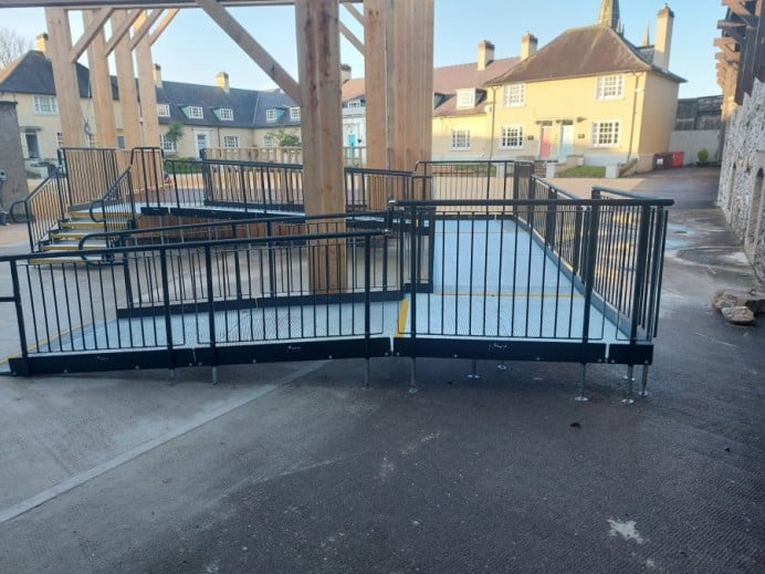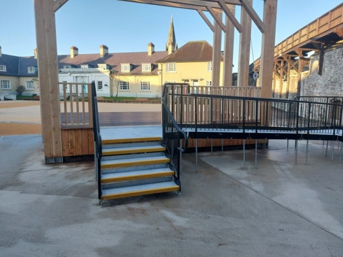 A modular stage ramp with steps was installed over concrete and took only two days to complete. Plus, it includes a compliant 1:15 gradient.
