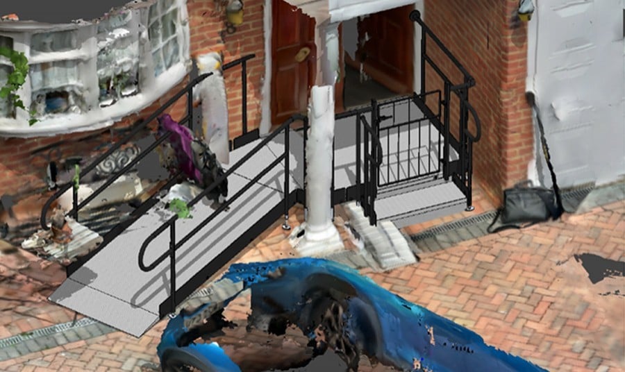 Once the photographing process was completed, our CAD designer plotted a 3D visual of the ramp on top of the lidar model. The ramp design bypasses the bay window and the pillar obstruction.