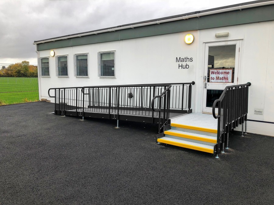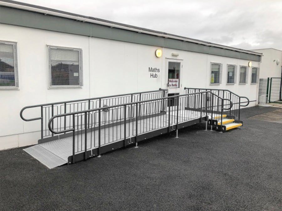 A modular access ramp and accompanying steps leading to a newly constructed modular classroom.