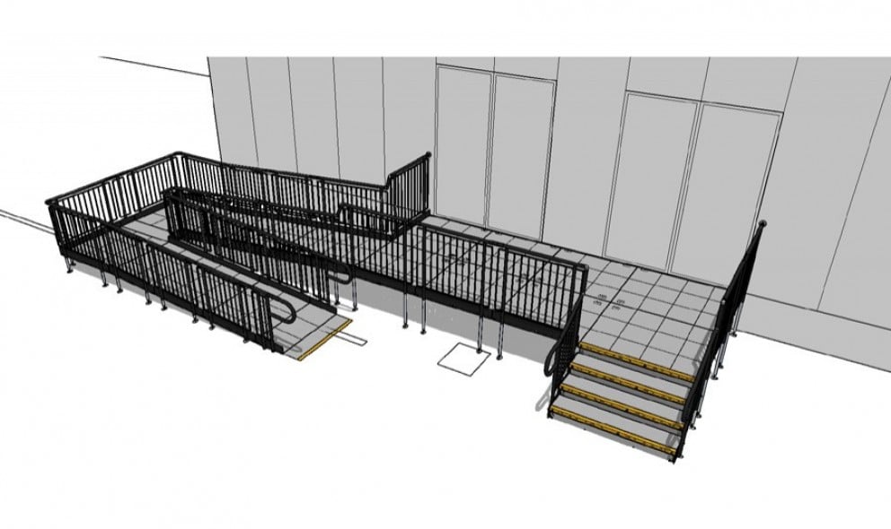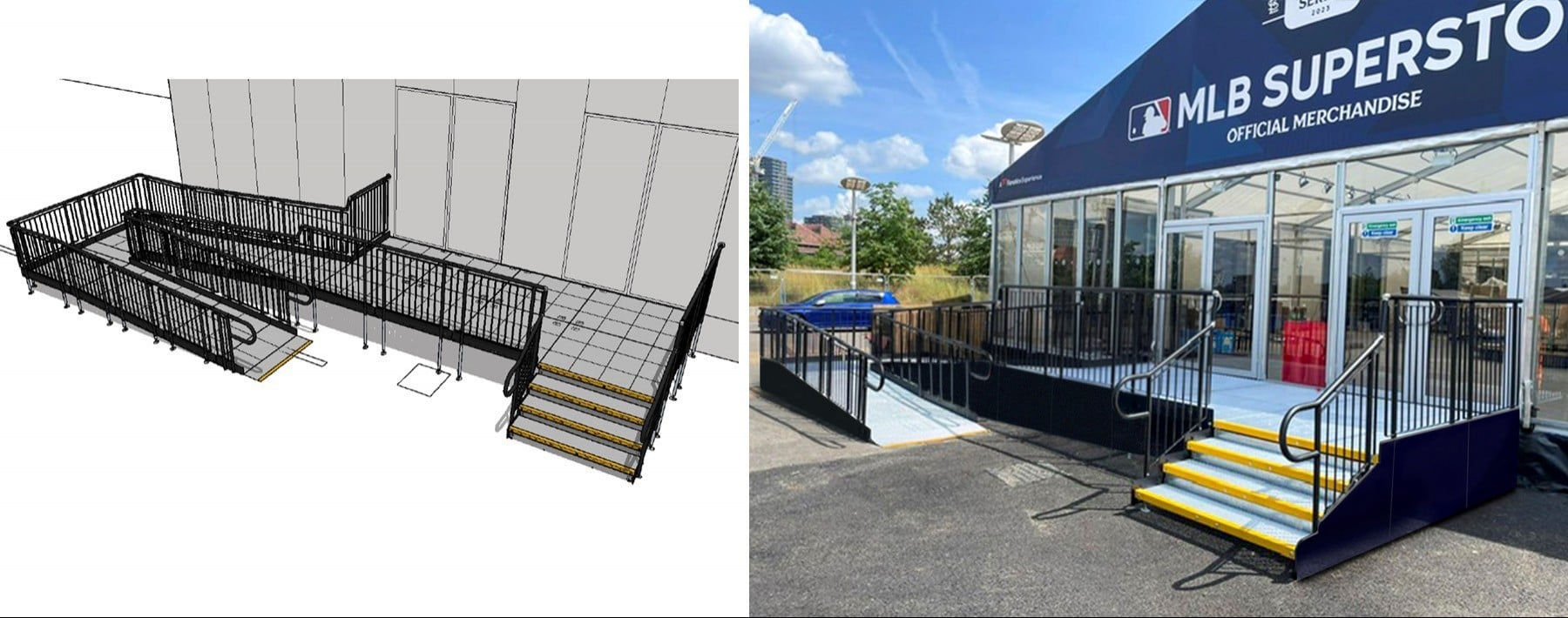 Providing a temporary modular ramp with steps to ensure safe, convenient access to the pop-up shop for customers purchasing official merchandise.