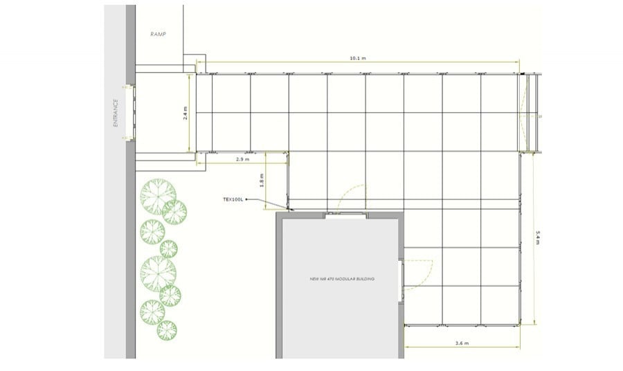 A walkway constructed from modular platforms. The walkway would enable staff to transport patients via hospital beds to the external MRI unit for vital scans.