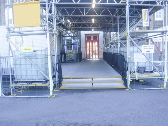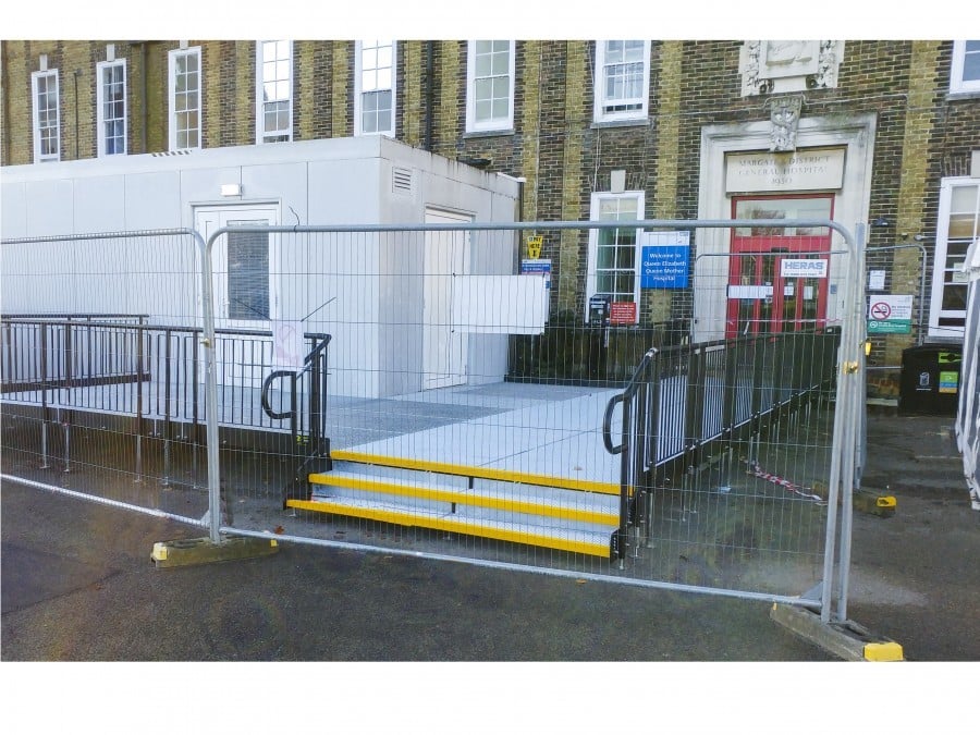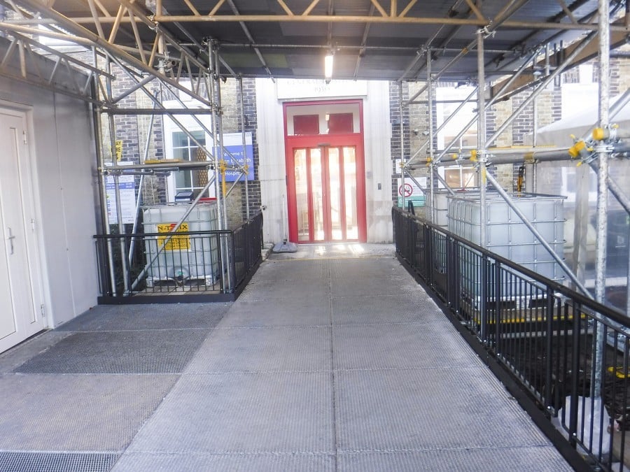 Another company installed a scaffolding canopy to ensure patients in beds are kept dry whilst being transferred for tests.