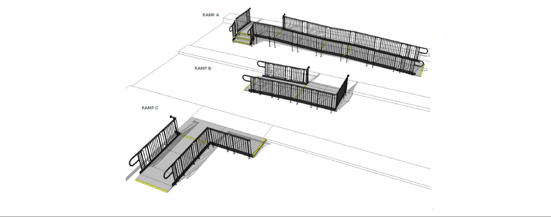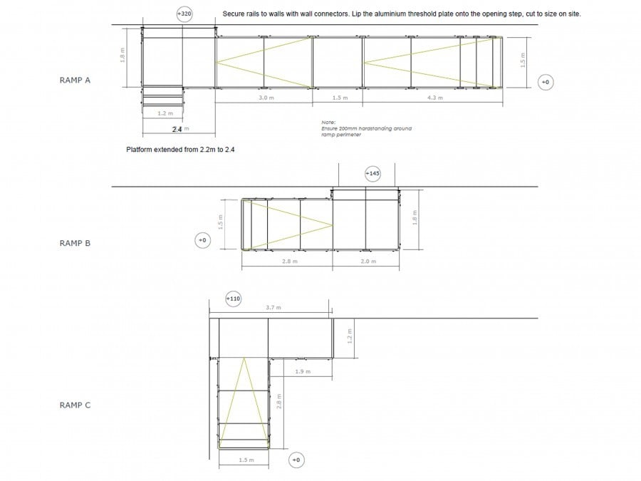 Ramps were drawn with a 1:15 gradient and a platform width of 1500mm. These are minimum recommendations set out bybuilding regulations standards that apply in Ireland.