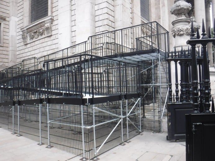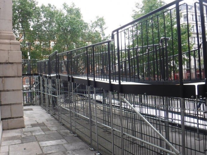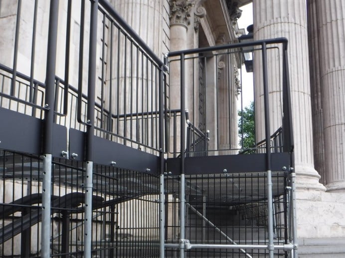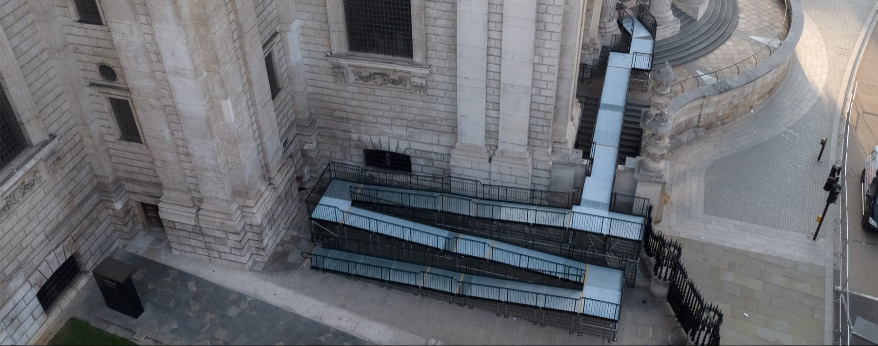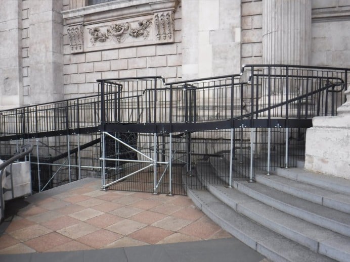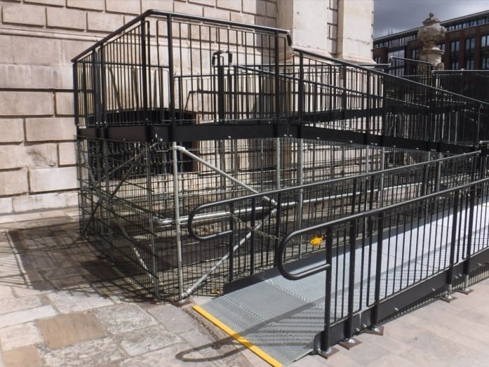 To ensure stability, the ramp feet were secured with cross-braces rather than being bolted down. This precaution was taken to prevent any potential damage to the historic cobbled ground.