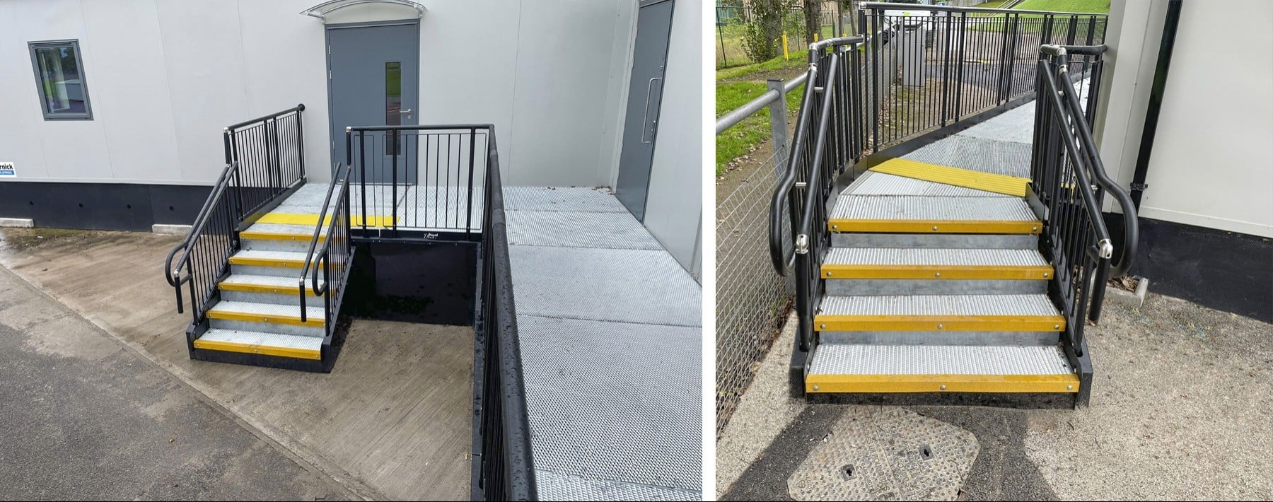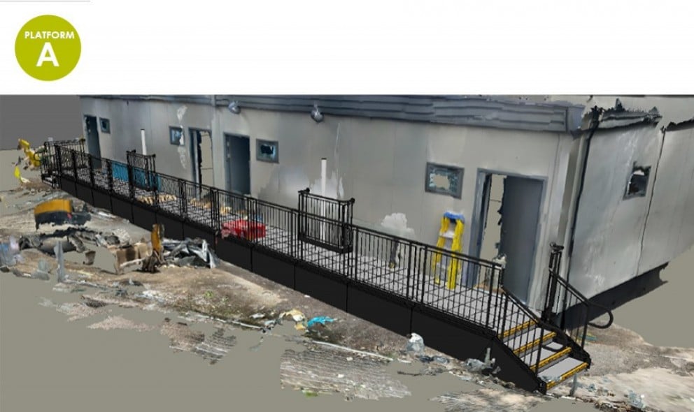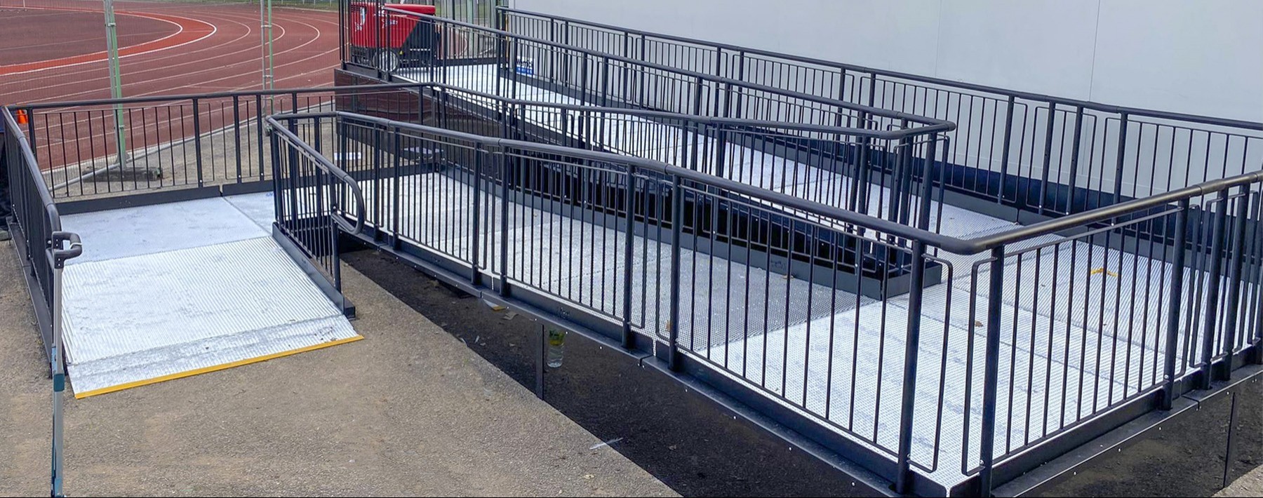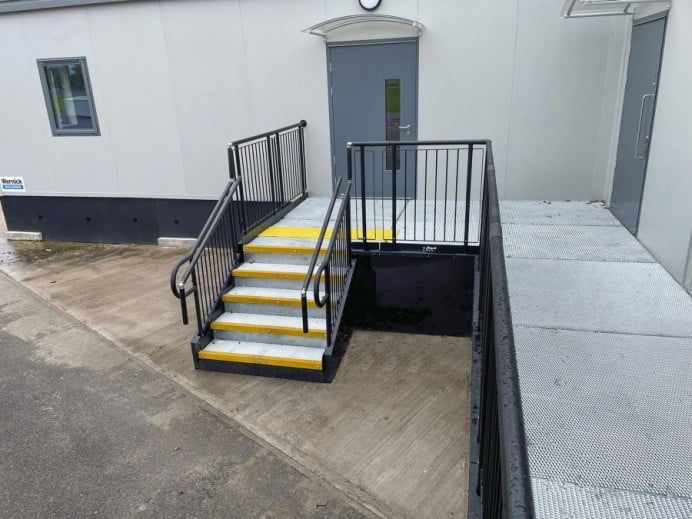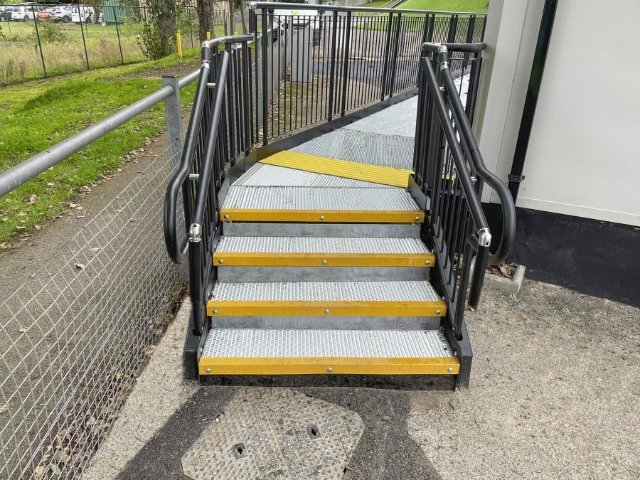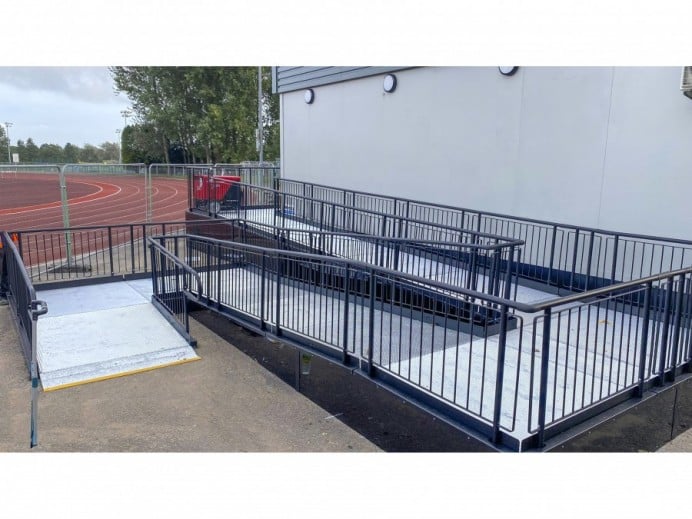 The installation of a ramp, platform, and steps to provide convenient access for students to the newly built modular changing facility near the running track.