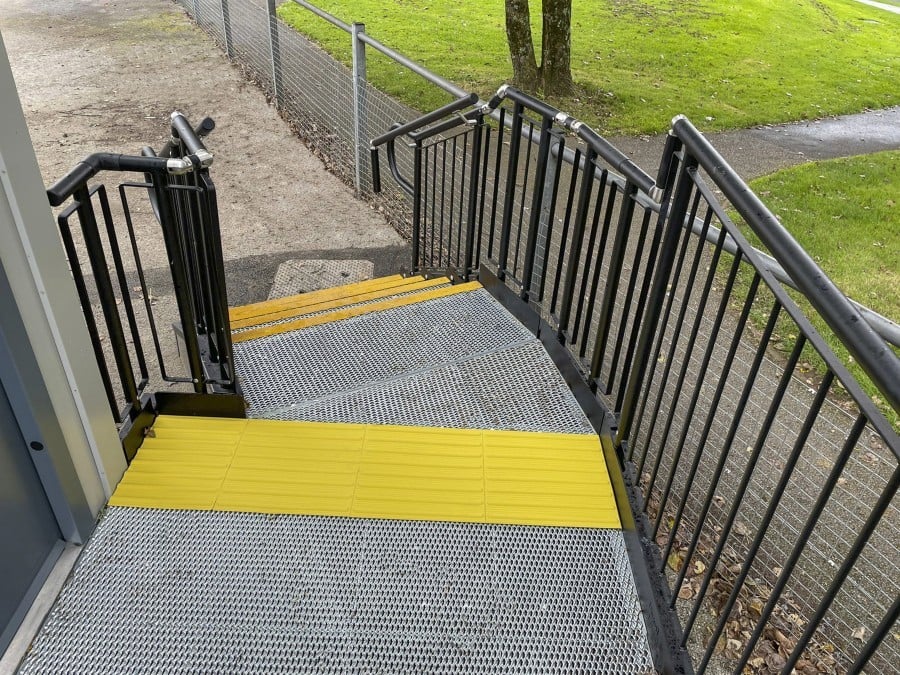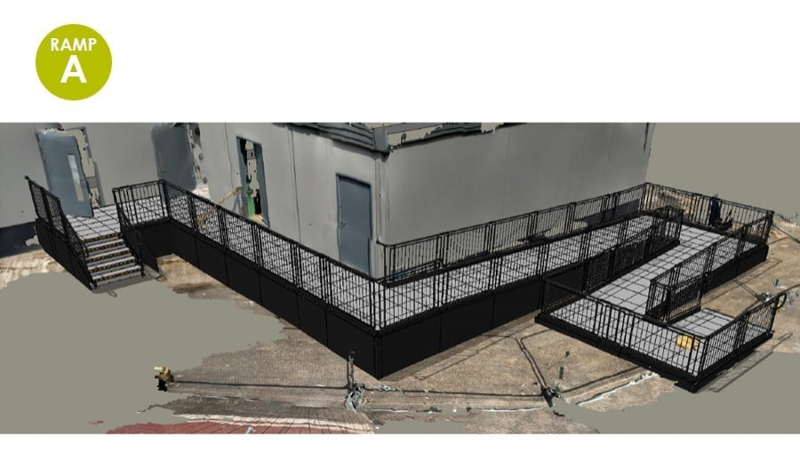 The ramp and platform run parallel to the building and feature compliant step units for easy access by abled-bodied users.