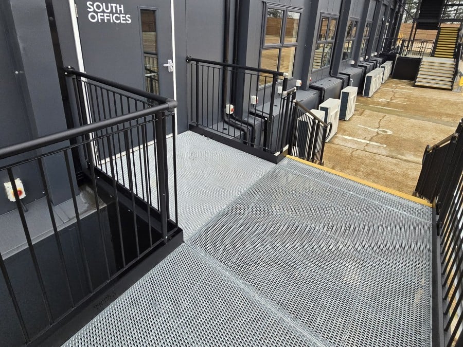 - Slip-Resistant Mesh Platform - A multi-directional walkway with self-draining steel mesh and a galvanised finish.