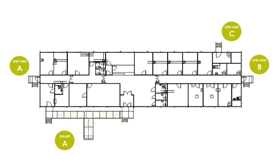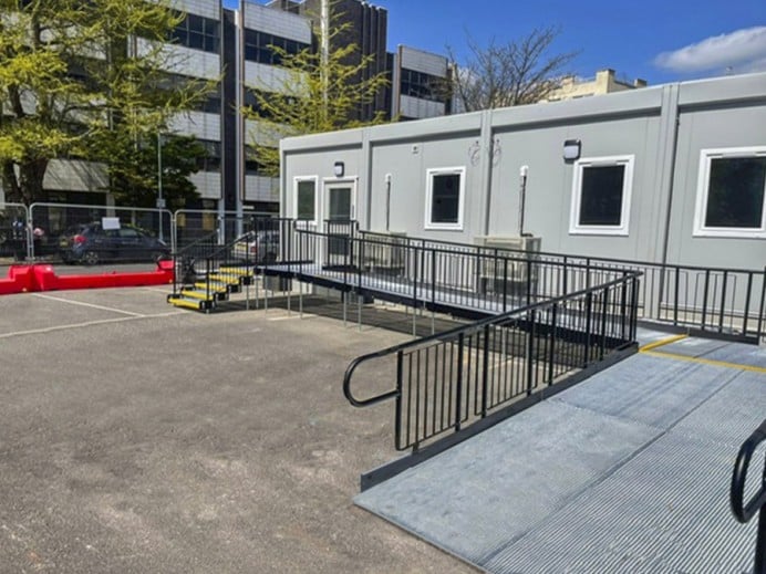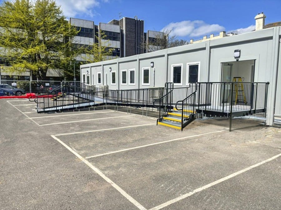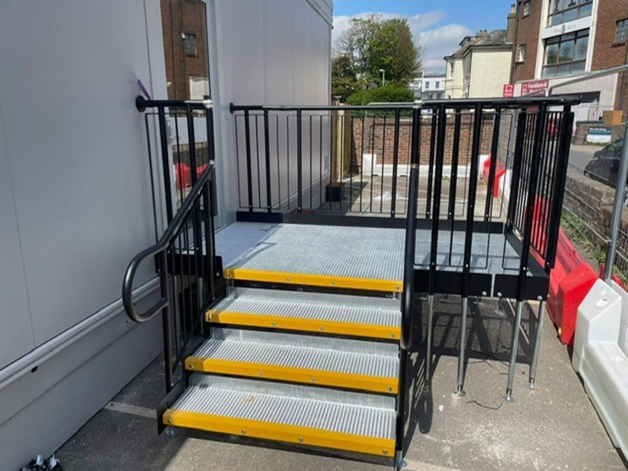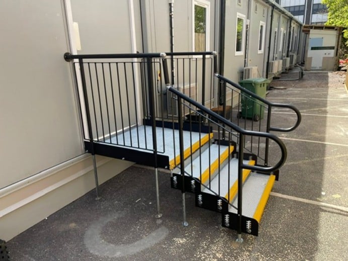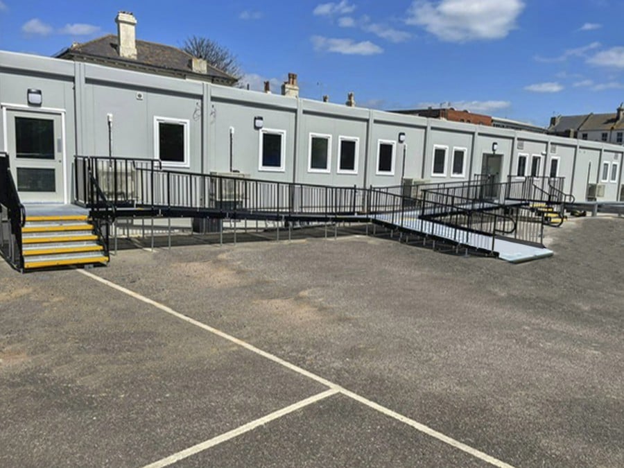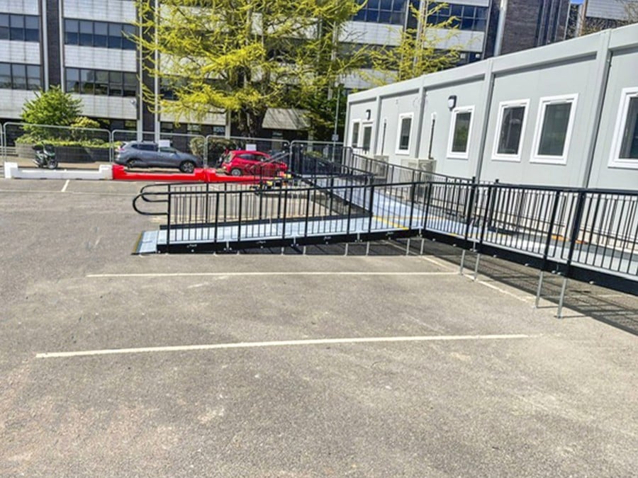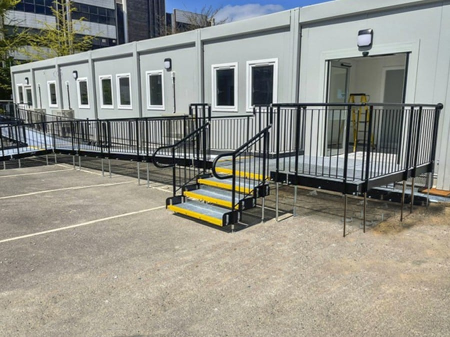 A rental ramp and steps to the units were essential and will be in situ for over two years. Also, full compliancy with Document M & K of the Building Regulations and the latest fire safety guidelines was necessary.