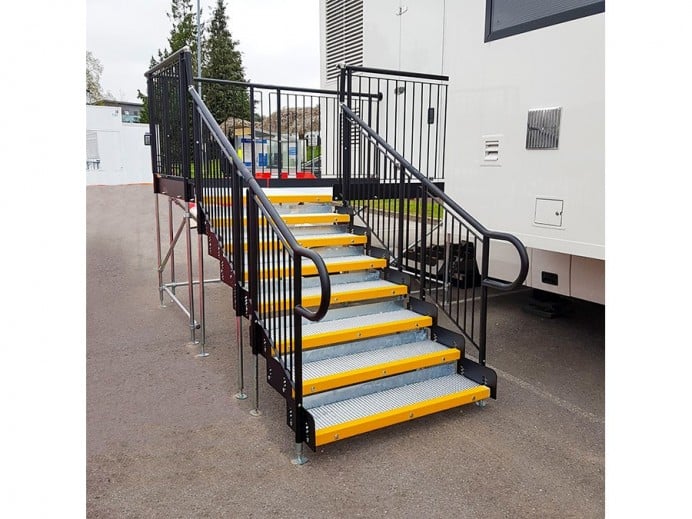 The minimum width required, as per building regulations, is 1200mm for buildings other than dwellings and 900mm for residential use. You can choose as many steps as necessary, with one or more extensions available, and a platform included.