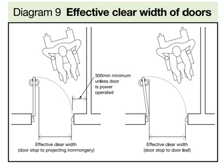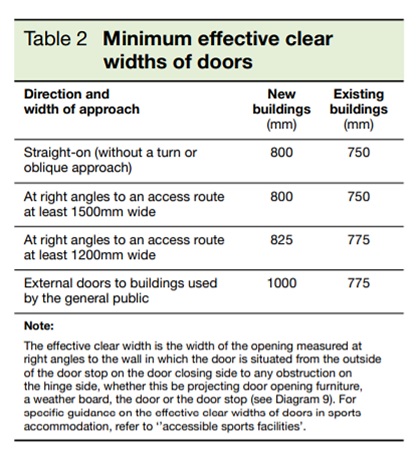 Document M, Volume 2 states that accessible doors should be wide enough to allow various individuals to use them, including wheelchair users, people with assistance dogs, those carrying luggage, parents with small children and pushchairs (including double buggies that are wider than wheelchairs).