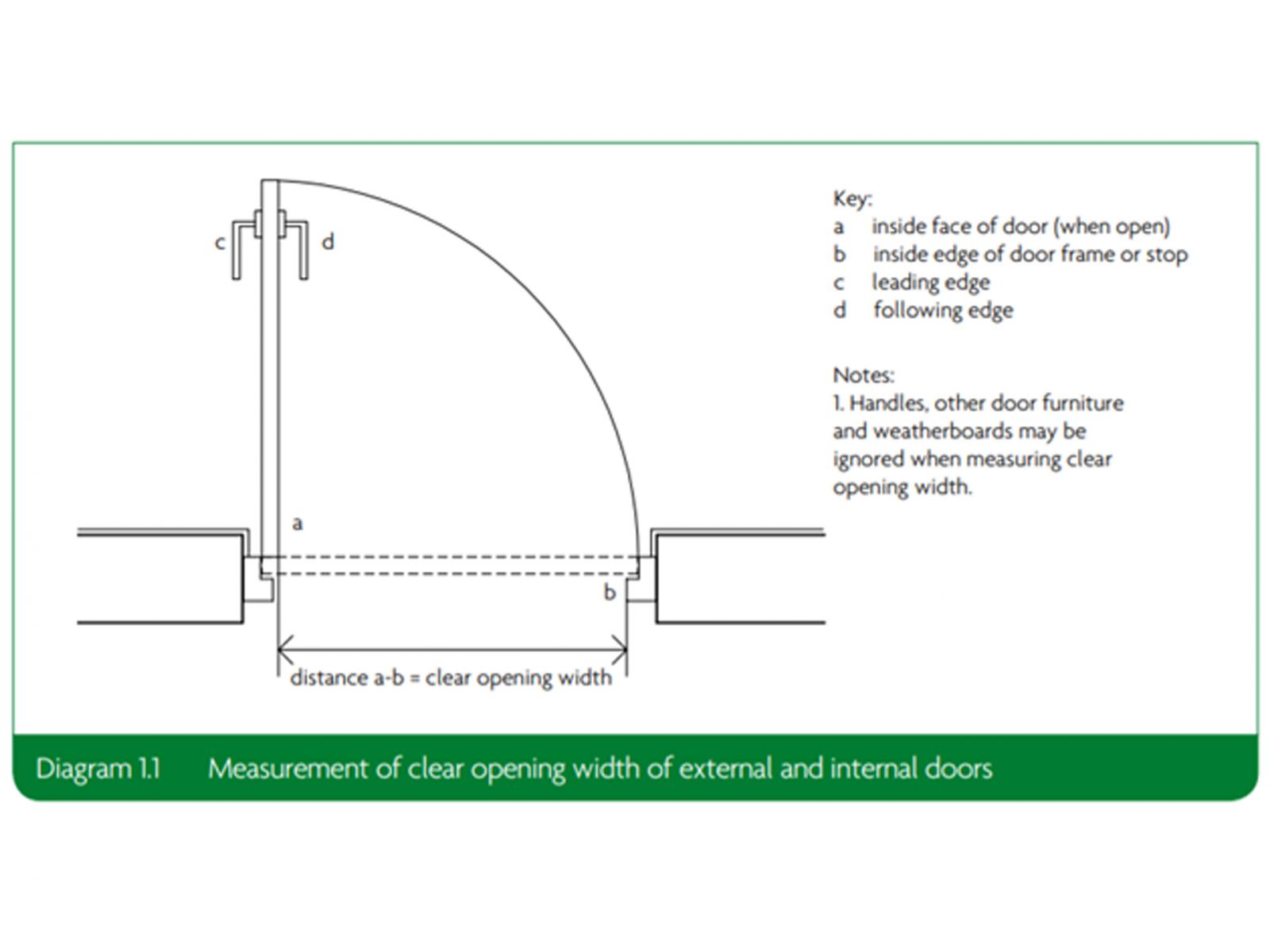 Part M, Section 1B of the Building Regulations specifies that an entrance door must have a minimum clear opening width of 775mm, as illustrated in Diagram 1.1.