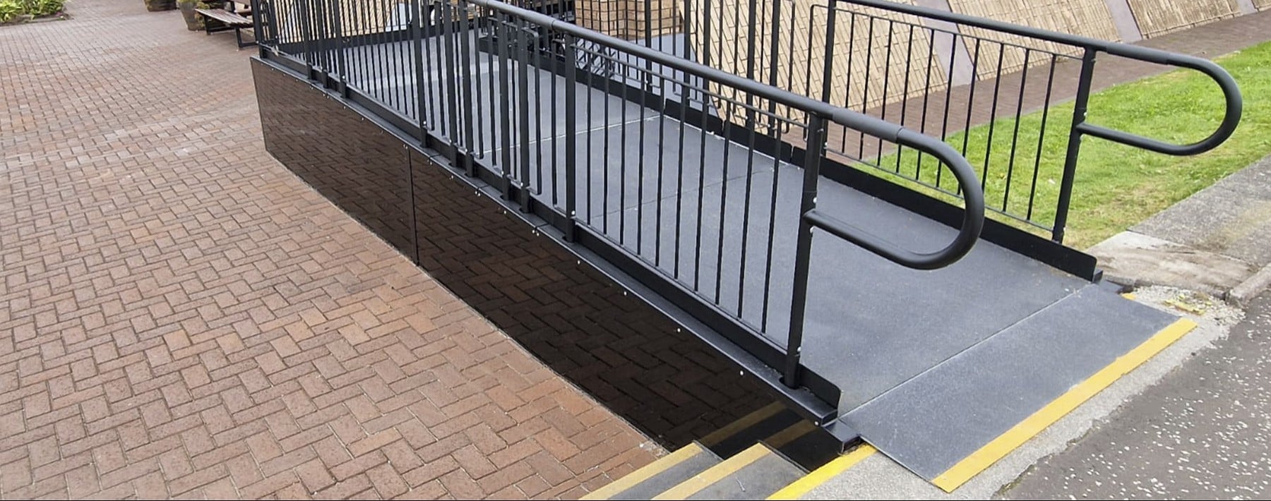 Our ramps are installed with a dark grey GRP sheet as standard, but other colour options are available if needed, including yellow, blue, and black.