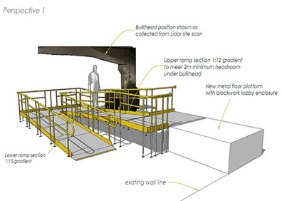 This technology allows our site surveyors to accurately scan and map the dimensions of objects within the space, including the flooring, ceiling, pillars, and overhead ring beams. With this detailed information, the design of the ramp can be carefully crafted to work around these obstacles effectively.